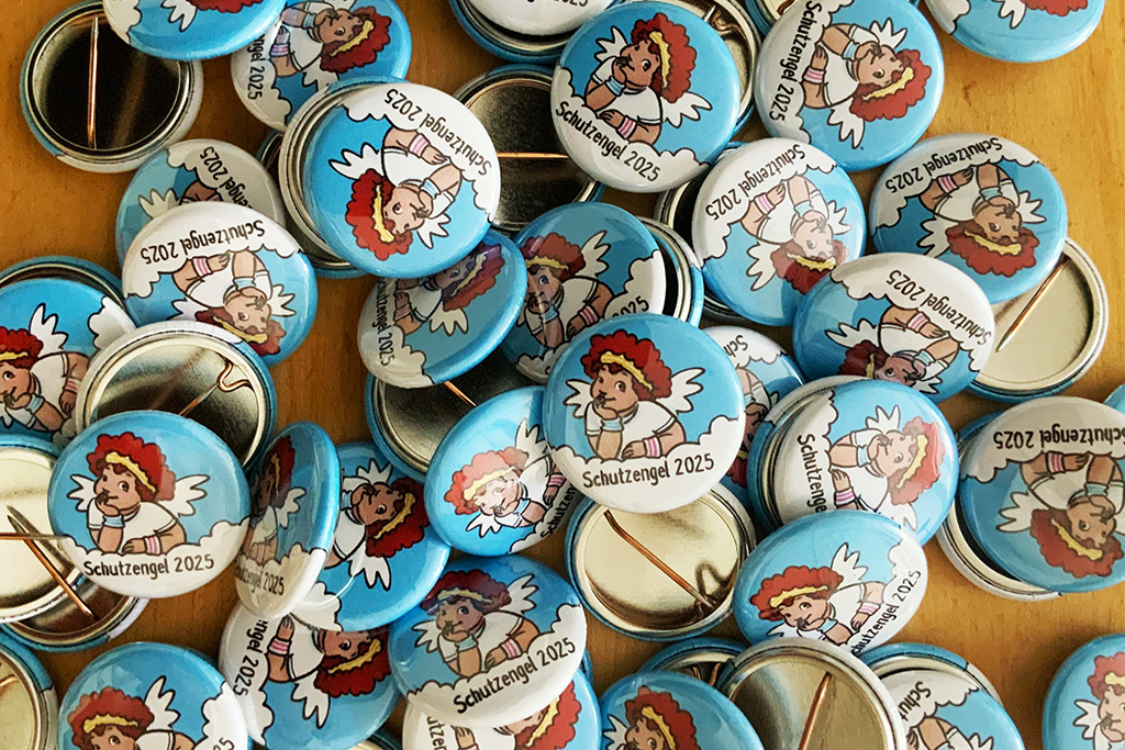 Alle Teilnehmenden bekommen bei uns einen Schutzengel-Button (schließlich laufen wir für das Haus Schutzengel). Dieser Button wird in jedem Jahr von einer*m anderen Künstler*in gestaltet. In diesem Jahr war Friederike Ablang so freundlich und hat für den guten Zweck diesen schönen Button gestaltet.