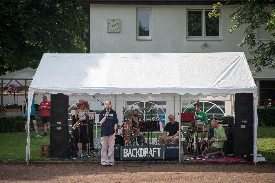 Um elf Uhr begrüßte ich alle Teilnehmer mit einer leicht emotionalen Ansprache… das musste diesmal einfach sein. Danach ging es für die Läufer gleich los – und viele Runden wurden gelaufen oder gewalkt. Musikalisch unterstützt wurden sie dabei von der Band BACKDRAFT aus Celle, die gut gelaunt für uns aufspielte. BACKDRAFT war zum ersten Mal dabei und spielte richtig tolle Laufmusik.