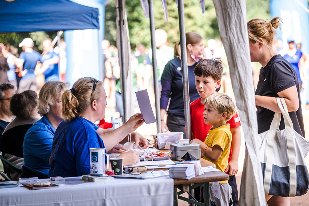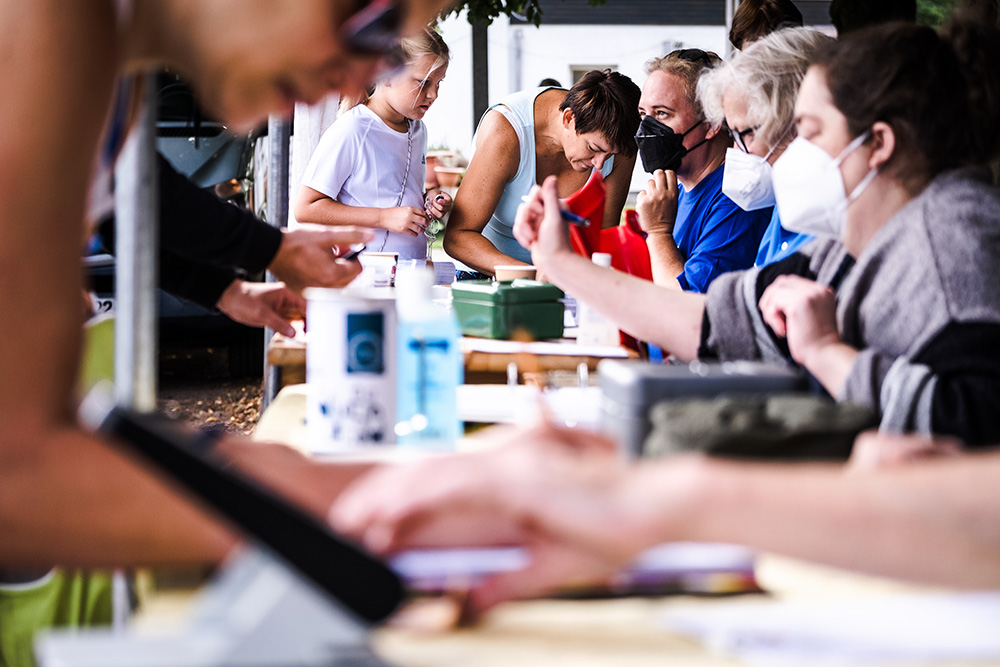 Vor dem Startschuß konnten sich alle Läufer*innen bei der Anmeldung ihren diesjährigen (von mit gezeichneten) Schutzengel-Button abholen